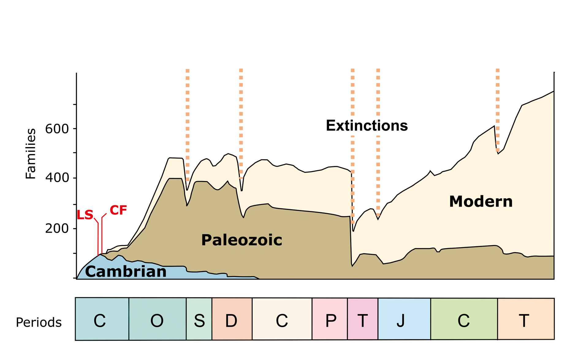 Figure 11. The classic Sepkoski diversity curve of marine invertebrate families through Phanerozoic time, documenting the Cambrian, Paleozoic, and Modern Evolutionary Faunas, and the ‘Big Five’ mass extinctions (dashed vertical lines) of marine invertebrates (modified from Sepkoski, Reference Sepkoski1981; Harper, Reference Harper2006). Solid red vertical lines represent the fauna of the Latham Shale (LS) and Cadiz Formation (CF). Geological periods (left to right): C = Cambrian; O = Ordovician; S = Silurian; D = Devonian; C = Carboniferous; P = Permian; T = Triassic; J = Jurassic; C = Cretaceous; T = Tertiary.