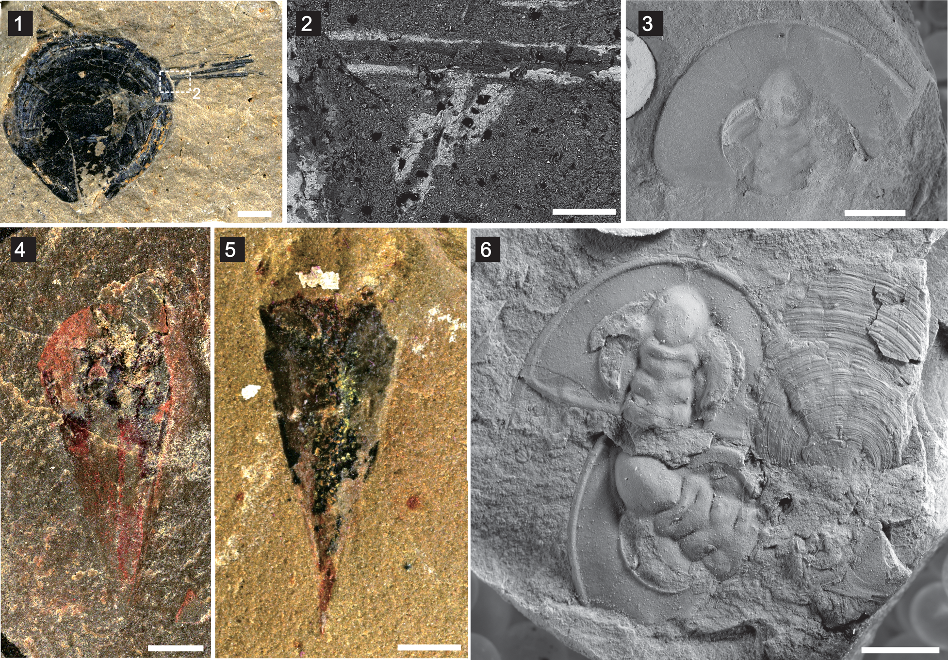 Figure 6. Other taxa from the Latham Shale: (1) brachiopod individual with possible Sphenothallus attached on the anterolateral part of the shell (UCR 7002/301), with boxed area of (2); (2) enlarged backscattered SEM image of boxed area in (1); (3) Olenellus nevadensis (Walcott, Reference Walcott1910) (UCR 10/3239); (4, 5) Hyolithes whitei Resser, Reference Resser1938 (UCR 10/2340, 10125/12, respectively); (6) Olenellus nevadensis (Walcott, Reference Walcott1910) and Paterina prospectensis (Walcott, Reference Walcott1884) (UCR 10). Scale bars = 2 mm (1, 3–6); 200 μm (2).