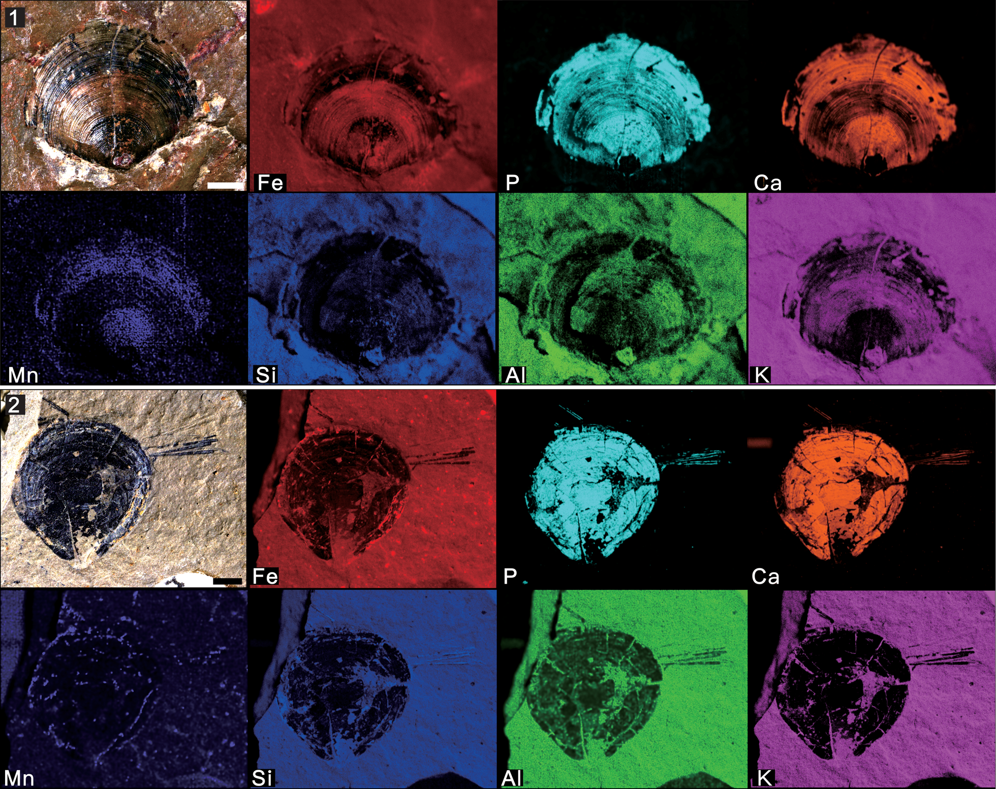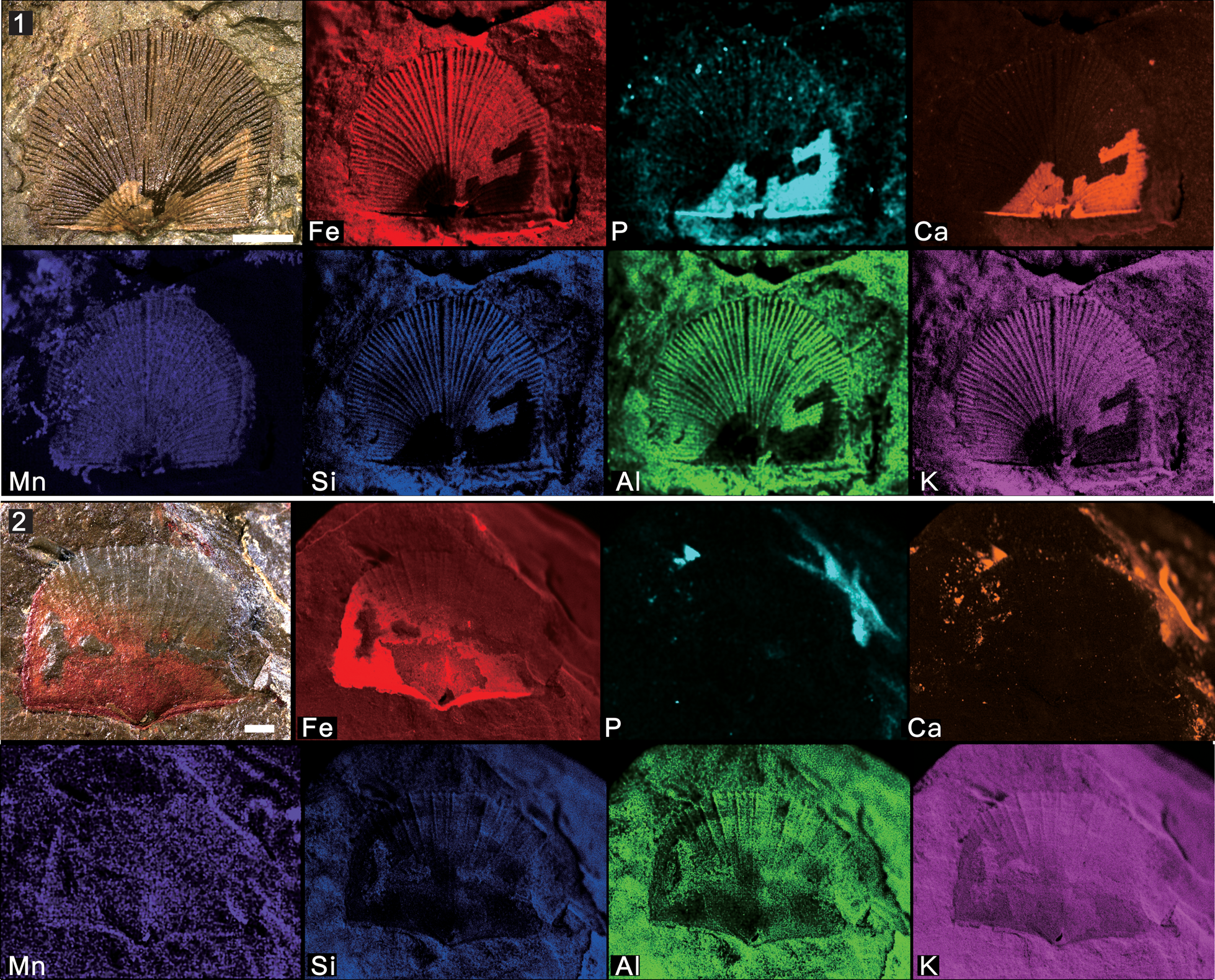 Figure 7. Micro X-ray florescence maps, showing elemental abundances of iron, phosphorus, calcium, manganese, silicon, aluminum, and potassium: (1) Mickwitzia occidens Walcott, Reference Walcott1908 from the Latham Shale (UCR 10/8/1, the same specimen displayed in Fig. 4.8); (2) Heliomedusa orienta Sun and Hou, Reference Sun and Hou1987 from the Chengjiang Lagerstätte (ELI SJZ 2322). Scale bars = 2 mm.
