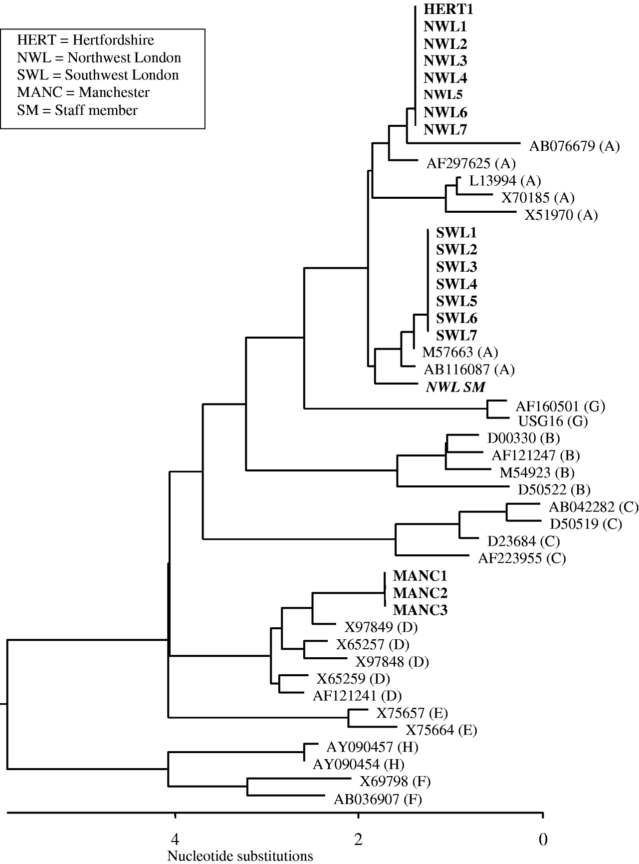 Seventeen of the 21 patients with HBsAg had clear serological evidence of acute hepatitis B infection, being anti-HBc IgM positive. Two additional patients (NWL5 and SWL6), had altered serological markers consistent with resolving acute infection and early acute infection, respectively (Table 2). Only 11 individuals had symptoms consistent with acute hepatitis, seven of whom died, with hepatitis B infection recorded as a contributory or underlying factor in five of these patients. HBV DNA sequencing performed on all seven patients from northwest London were found to be genotype A and identical to each other (Fig. 1). The strain found in the Hertfordshire patient was identical to those identified in northwest London. In the Manchester outbreak, HBV DNA could only be recovered from three of the patients with acute hepatitis and were found to be genotype D and identical to each other. All seven patients from southwest London were shown to be genotype A and identical to each other, but distinct from those in both northwest London and Hertfordshire (Fig. 1).