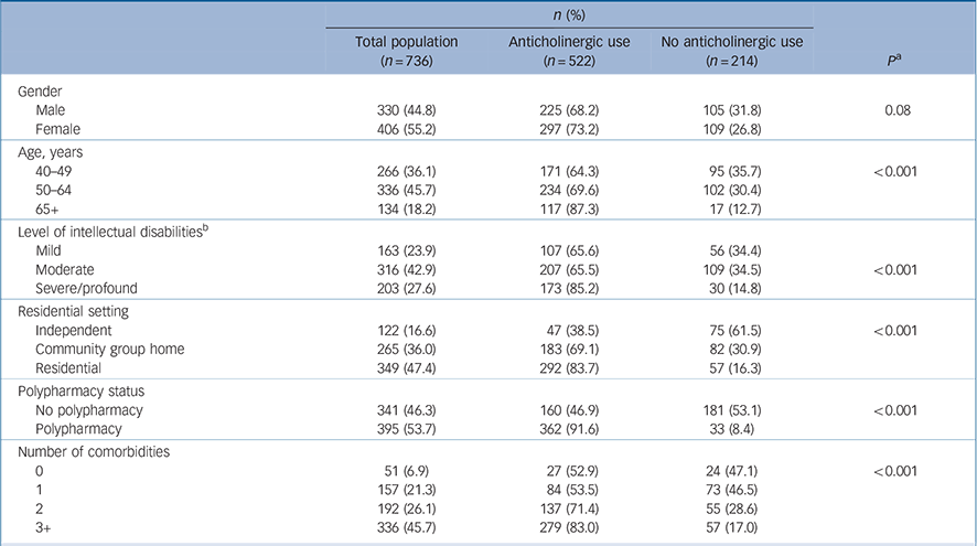 People with intellectual disabilities continue to have a shorter life expectancy compared with the general population, are at increased risk of mortality from preventable or treatable illnesses, Reference Heslop, Blair, Fleming, Hoghton, Marriott and Russ8 and experience health inequities, including barriers to accessing primary care. Reference Buszewicz, Welch, Horsfall, Nazareth, Osborn and Hassiotis9 They experience up to 2.5 times the health problems Reference Haveman, Heller, Lee, Maaskant, Shooshtari and Strydom10 and higher incidence of morbidities such as dental disease, eye disease, epilepsy and dementia. Reference Haveman, Perry, Salvador-Carulla, Walsh, Kerr and Van Schrojenstein11,Reference McCarron, O'Dwyer, Burke, McGlinchey and McCallion12 Dual diagnosis is common, with one study reporting 41% of adults with intellectual disabilities with mental illness, Reference Cooper, Smiley, Morrison, Williamson and Allan13 which increases the likelihood of polypharmacy. Higher use of antipsychotics and other psychotropics prescribed to manage mental health conditions and challenging behaviours is a concern Reference Tyrer, Cooper and Hassiotis14–16 and may confer additional risk as organic brain dysfunction may lead to idiosyncratic responses to drugs. Reference Bhaumik and Branford17 Drug-induced anticholinergic activity is thought to be additive; the overall burden of anticholinergic drugs determining the risk of adverse effects. Reference Han, Agostini and Allore18 People with intellectual disabilities may be at additional risk of experiencing the ‘prescribing cascade’ as for example, the high prevalence of antipsychotic use may lead to the prescribing of anticholinergics for movement disorders (extrapyramidal symptoms; anatomical therapeutic chemical (ATC) N04A), a practice no longer recommended in older people. Reference O'Mahony, O'Sullivan, Byrne, O'Connor, Ryan and Gallagher5,Reference Ruxton, Woodman and Mangoni6 Anticholinergic effects may be misattributed to a consequence of the normal ageing process and drugs with anticholinergic properties may be a cause of unrecognised adverse drug reactions. Reference Mintzer and Burns19