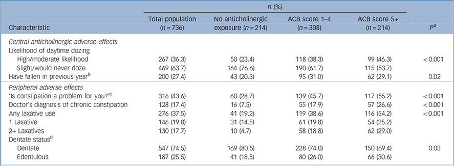 The relationship between anticholinergic exposure and indicators of anticholinergic adverse effects was examined; if the participant had reported fall(s) in the previous year, daytime dozing, constipation or physician-diagnosed chronic constipation and laxative use. Participants were also divided into those who were dentate or edentulous. Reference Mac Giolla Phadraig, McCallion, Cleary, McGlinchey, Burke and McCarron29