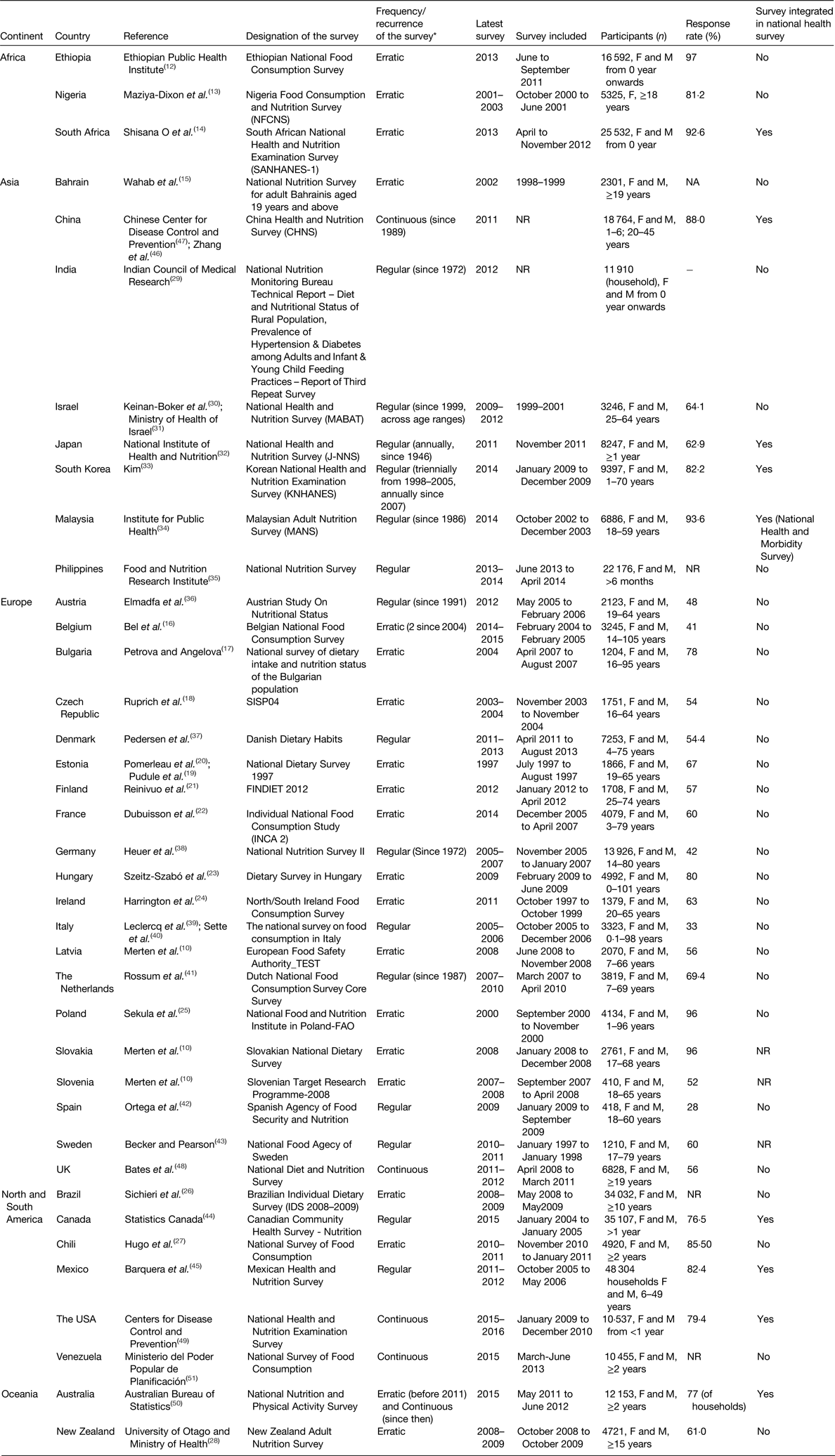In Table 2 and Supplementary Table S1, the fieldwork aspects of the nutrition surveys are presented. Interviews were conducted either face-to-face or by telephone. Places other than the homes of the participants for administrating the DIA were examination centres (e.g. South Korea and several European countries and mobile examination centres in the USA). The time-span of the fieldwork was at least 1 year (all seasons) in almost all European countries, Canada, the USA, Brazil, South Korea (Korean NHANES 2008 and onwards), Malaysia, Australia and New Zealand. In the African countries running an IFCS, only few seasons/months were included in the fieldwork period.
