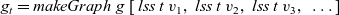 \begin{equation*}\begin{array}{lcl}g & :: & \mathit{Graph}~\mathit{Bool}~\mathit{Int} \\g & = & \textbf{let}~\mathit{v1} = Vertex~1~True~[\,] \\ & & \phantom{\textbf{let}}~\mathit{v2} = Vertex~2~True~[(1, \mathit{v1})] \\ & & \phantom{\textbf{let}}~\mathit{v3} = Vertex~3~True~[(1, \mathit{v1})] \\ & & \phantom{\textbf{let}}~\mathit{v4} = Vertex~4~True~[(1,\mathit{v2}),~(1,\mathit{v3}),~(1,\mathit{v5})] \\ & & \phantom{\textbf{let}}~\mathit{v5} = Vertex~5~False~[\,] \\ & & \textbf{in}~[\mathit{v1},~\mathit{v2},~\mathit{v3},~\mathit{v4},~\mathit{v5}]\end{array}\end{equation*}