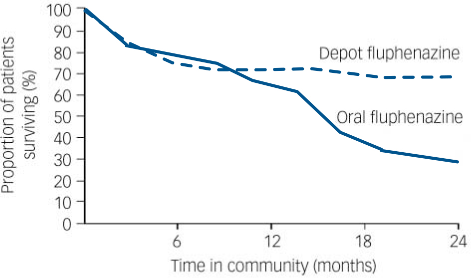 A series of double-blind prospective studies confirmed the importance of LAIs in both chronic or relapsing schizophrenia and first-illness schizophrenia. Reference Hogarty, Goldberg and Schooler7–Reference Pietzcker, Gaebel, Kopcke, Linden and Muller21 In a comparison of oral and LAI fluphenazine, Hogarty et al demonstrated that relapse rates were notably worse for patients taking the oral formulation, but this was not apparent until after at least a year of treatment (Fig. 1). Reference Hogarty, Schooler, Ulrich, Mussare, Ferro and Herron22 The prescribing of LAIs for out-patient maintenance therapy continued to grow worldwide, although the use varied considerably in different countries. Reference Kissling23 Psychiatrists in the UK appeared to be initially using LAIs most widely, with one study showing that 80% of out-patients with psychosis were receiving this treatment. Reference Johnson and Kissling24 Sweden and Austria had approximately 50% of out-patients treated with an LAI. Reference Dencker and Kissling25,Reference Fleischhacker, Meise and Kissling26 Germany and the USA had the lowest use: only 12–20% of patients in the USA were receiving LAIs, and overall the use in Germany was probably in the region of 20–30%. Both America and Germany had particular delivery problems, with reliance on general practitioners and other professionals to give the injections.