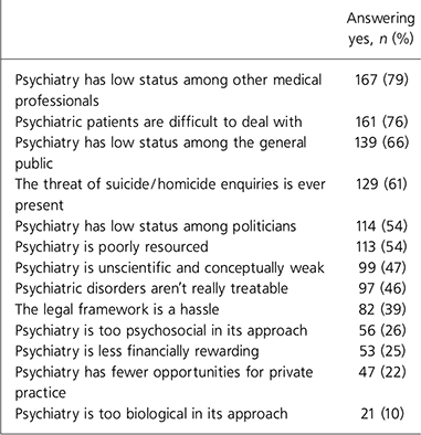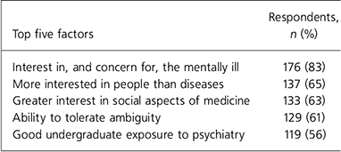It is perhaps unsurprising (but certainly reassuring) that ‘interest in and concern for the mentally ill’ was rated as the most important factor in motivating respondents to enter psychiatry. Although interest in social and interpersonal aspects of medicine emerged also as positive factors for recruitment, psychiatry was not seen as either too psychosocial or too biological in its approach (Table 1).