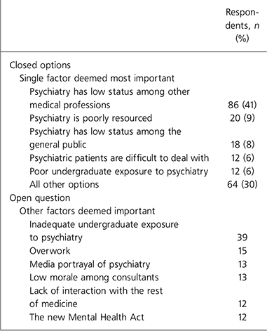 The first two questions asked respondents to state views on whether a number of factors influence recruitment in a ‘yes’ or ‘ no’ forced choice format. These covered a range of topics, including the perceived difficulty of dealing with and treating individuals with psychiatric disorders, the status of psychiatry within medicine and within society at large, the legal framework in which psychiatry is practised and undergraduate exposure to psychiatry. In addition there was space to expand on responses and to volunteer additional factors felt to be of importance by the respondents.