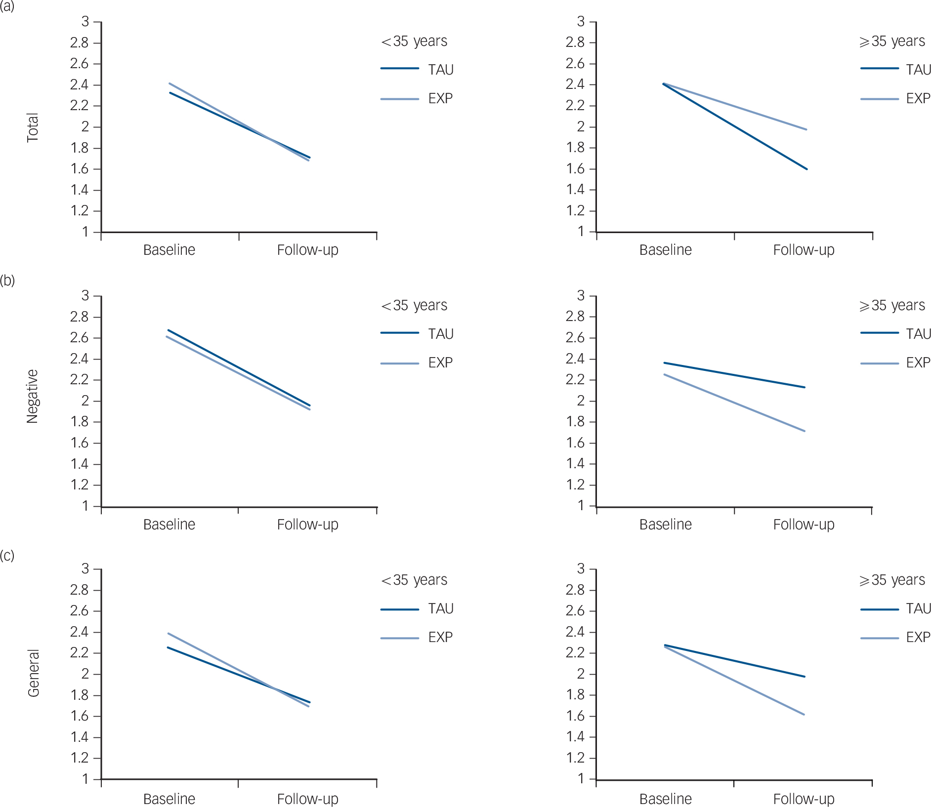 In order to determine the age cut-off at which the experimental treatment started to be significantly superior to TAU, age was categorised using different cut-offs (20, 25, 30, 35 years) in a sensitivity analysis. This analysis showed that starting from 35 years of age there was a significant treatment effect on PANSS (PANSS total: b = −0.12, P = 0.023, moderator effect size = −0.06; PANSS negative: b = −0.18, P = 0.032, moderator effect size = −0.06; PANSS general: b = −0.13, P = 0.015, moderator effect size = −0.07) (Fig. 1).