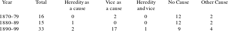 In this table, ‘vice’ refers to non-reproductive sexual activity or non-marital sexual activity, and substance and alcohol abuse. Heredity refers to a family history of mental illness. ‘Both’ refers to patients who either have a family history of mental illness and have themselves indulged in vice, or whose family history includes individuals who yielded to vice.Footnote 55 This table shows that the proportion of GPI patients whose condition was attributed to vice increased dramatically in the last decade of the nineteenth century, compared to the previous two decades. Justifications for this change can only be speculative, but an examination of contemporary medical texts from other countries, particularly Great Britain, mirrors this trend.