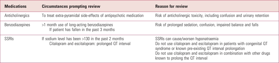 As already noted, people over 65 years of age often have multiple comorbidities and are therefore subject to polypharmacy. Research found that 45% of older adults attending an emergency department were taking five or more medications and 11% are taking ten or more (Banerjee Reference Banerjee, Mbamalu and Ebrahimi2011). A balance of under- and overprescribing is needed to avoid prescribing cascades and there are now several tools available to review a patient's medications and identify any drugs that are unnecessarily contributing to polypharmacy. One that has been used widely across general practice is STOPP/START (Screening Tool of Older People's Prescriptions/Screening Tool to Alert to Right Treatment), for which there is a strong evidence base (Gallagher Reference Gallagher, Ryan and Byrne2008). It consists of a list of 65 STOPP criteria and 22 START criteria, and has good interrater reliability. This is a tool that psychiatrists might want to use before commencing clozapine in an older patient, to help reduce the risk of drug interactions. Examples are shown in Table 2. Clinicians might also want to consider the effect of prescribing other psychotropics while a patient is on clozapine. The British National Formulary (BNF) highlights that commonly used antidepressants, in particular fluoxetine and paroxetine, can lead to an increase in plasma clozapine levels, and therefore risk potential toxicity (Joint Formulary Committee 2017). Sertraline has a similar effect, but to a lesser degree. Clozapine use with lithium can increase the risk of extra-pyramidal side-effects and neurotoxicity, and serious adverse events have been reported with concomitant use of clozapine and benzodiazepines.