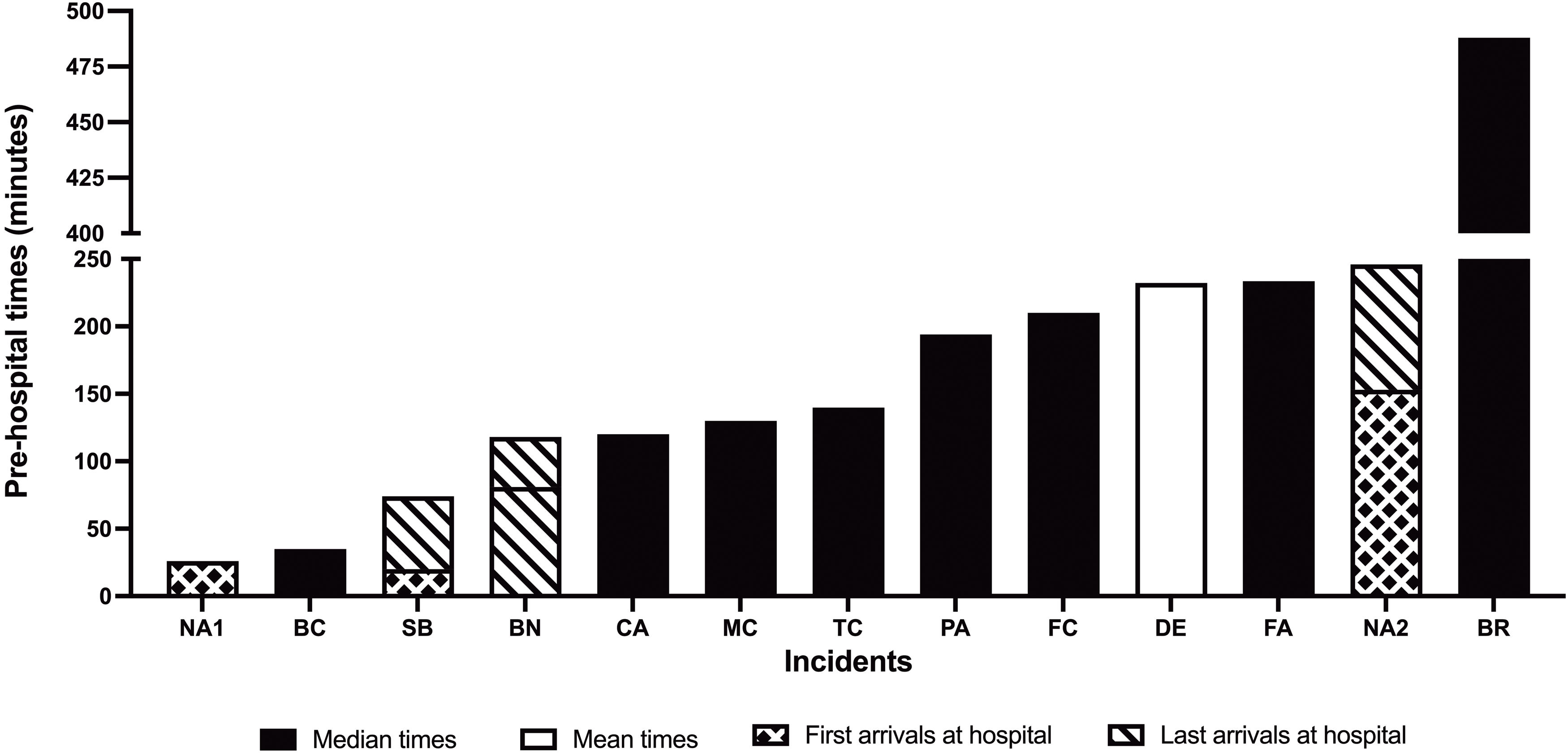 In the last 2 decades, the number of mass casualty incidents (MCIs) has risen globally, with over 2 million fatalities and many more injured. 1 MCIs are short-term events that overwhelm local medical care systems, where the volume of patients exhausts available resources and capabilities. 2 The unprecedented number of recent major incidents has challenged the health systems, increased the need to review MCI responses, and review lessons from previous MCIs pre-hospital. Reference Brohi and Tallach3 Time to initial response in mass casualty events is crucial in determining outcomes in the early stages of an injured patients’ care. Reference Harmsen, Giannakopoulos and Moerbeek4,Reference Sampalis, Lavoie and Williams5 The time from injury to reaching definitive care is known as pre-hospital time (PHT). An extended pre-hospital period is associated with increased mortality rates, and contemporary trauma systems strive to reduce PHT to improve patient outcomes. Reference Harmsen, Giannakopoulos and Moerbeek4–Reference Heemskerk, Abode-Iyamah and Quinones-Hinojosa6