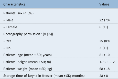 A total of 28 larynxes were made available for this study. The basic characteristics and descriptive statistics are displayed in Table 1. Twenty-five specimens had permission for photography and were able to have size measurements recorded using ImageJ software.