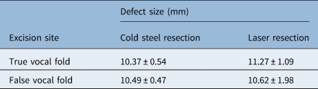Table 3. Defect sizes in true and false vocal fold specimens resected using cold steel and laser