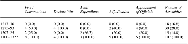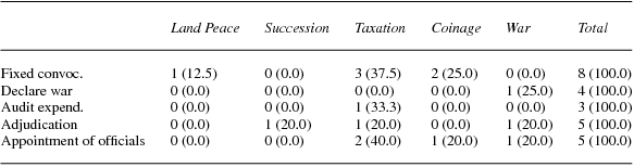 TABLE 1. Tallies of constitutional concessions, broken down on reasons for summoning assemblies, 1100–1327 (N, %)