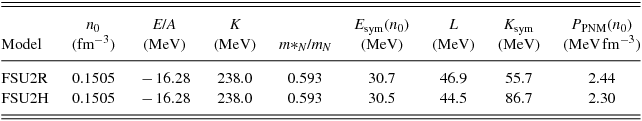 Table 2. Properties at saturation of the models FSU2R and FSU2H of this work. We show the saturation density (n 0), energy per particle (E/A), compressibility (K), and effective nucleon mass (m* N /mN ) in symmetric nuclear matter, as well as the symmetry energy (E sym), slope of the symmetry energy (L), curvature of the symmetry energy (K sym), and pressure of pure neutron matter (P PNM) at n 0.