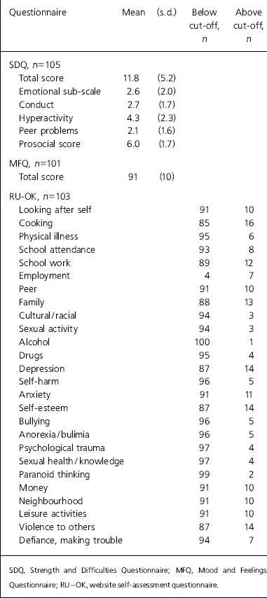 Table 1 shows the responses to the three questionnaires. The sub-scale scores for the SDQ are not significantly different from the national SDQ norms (http://www.sdqinfo.com). The numbers of teenagers classified as having a significant problem on the MFQ and the RU–OK questionnaire are also shown.