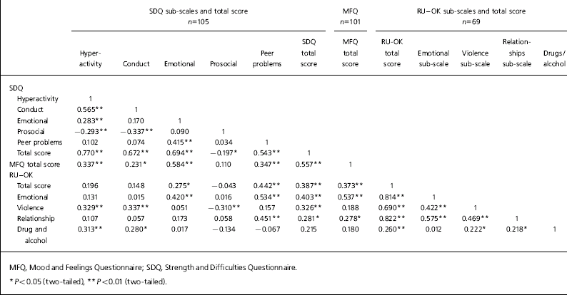 | SDQ sub-scales and total score n=105 | MFQ n=101 | RU—OK sub-scales and total score n=69 | ||||||||||