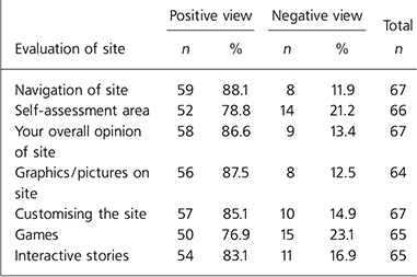 The summary results of the questionnaire are shown in Table 3. The 5-point scales were reduced to two categories as shown. Excellent, good and OK were combined into ‘positive’, and poor and bad into ‘negative’. Table 3 shows that 70–80% of respondents were positive about the site. There were no differences between the main-stream school and the specialist hospital school.