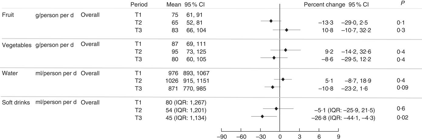 Fig. 1 Self-reported intake of fruit, vegetable, regular soft drink and water per person per day by period (T1, T2 and T3) and percent change from T1 to T2/T3. IQR, interquartile range.