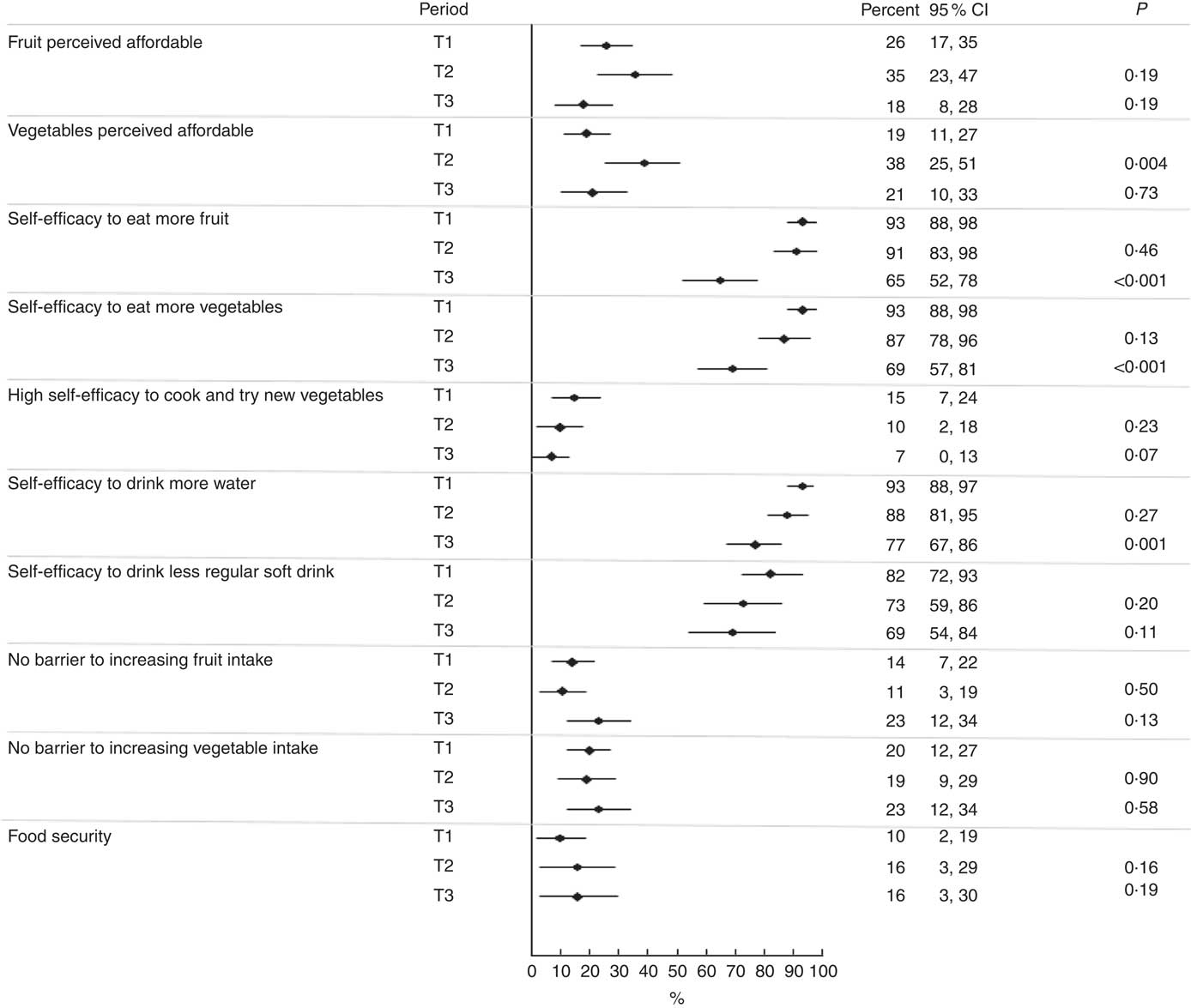 Perceived affordability of vegetables (P 0·004) improved at T2 and a non-significant increase was shown for fruit at T2. However, these improvements did not persist at T3 (Fig. 2). Self-efficacy to consume more fruit (P<0·001), vegetables (P <0·001) and water (P=0·001) and to cook and try new vegetables (P=0·07) was lower at T3 compared with T1, and did not differ between T1 and T2. A similar non-significant trend was observed for self-efficacy to drink less regular soft drink.