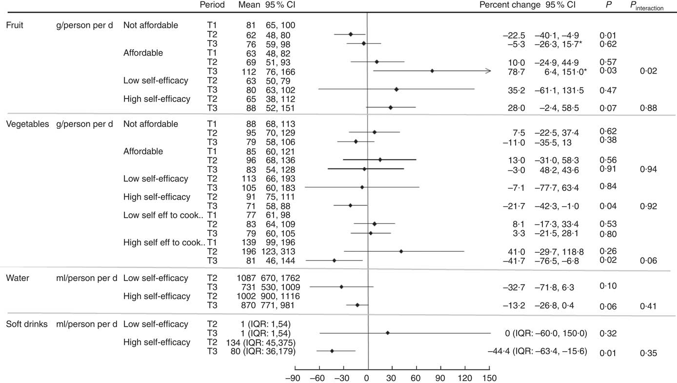Fig. 3 Percentage change in intake of fruit, vegetables, water and regular soft drink from T1 to T2/T3 and T2 to T3 (for self-efficacy), by mediator. *P<0·05 for interaction between mediator and period. IQR, interquartile range.