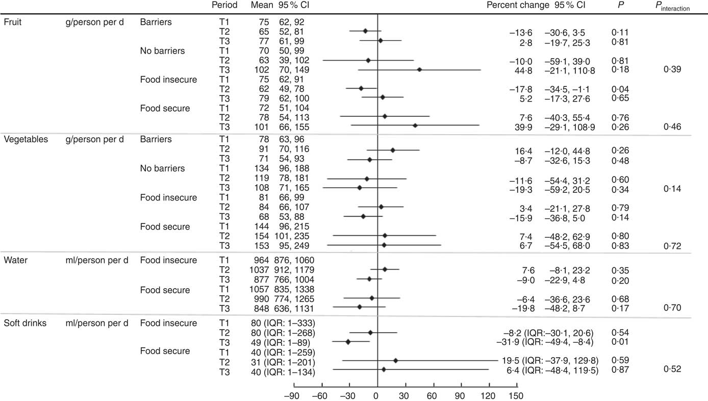 Similarly, given the substantial challenges to dietary improvement posed by the array of barriers present in Indigenous communities including food insecurity, it was hypothesised that these might moderate intervention effectiveness. We therefore assessed the barriers to individuals of high price, providing for a large number of people in the household, inadequate food storage and equipment for preparation, and food insecurity.