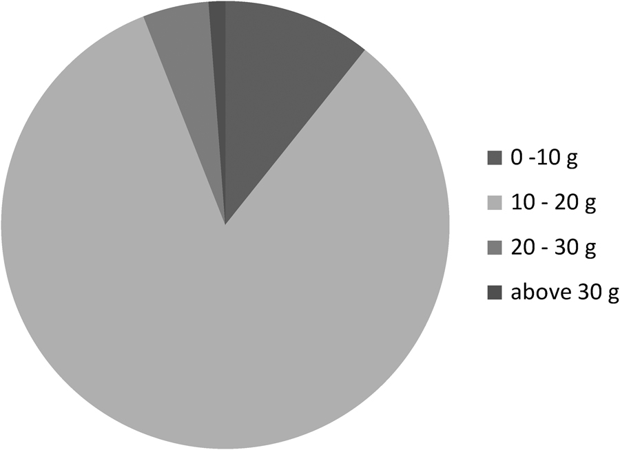 Here we present the analysis of the weight of the whorls, which seem to encompass a wide range of values (see below) with some chronological patterning. Ethnographical and experimental records suggest that weight and, to a certain extent, diameter, rather than shape, are functionally important for spinning. Bearing in mind that the chosen raw material might also influence both spinning techniques and spindle whorl sizes (eg, Barber Reference Barber1991, 42–4; Siennika Reference Siennika2014, 165), light spindle whorls, under 10 g, seem generally best to spin fine/light threads, whilst heavier whorls are more suited to thicker or coarser threads (Liu Reference Liu1978; Barber Reference Barber1991, 51–3; Olofsson et al. Reference Olofsson, Andersson Strand and Nosch2015) or for plying (Gleba Reference Gleba2008, 106). Although recent experiments have questioned these relationships, suggesting that the skills of spinners might be more important (Kania Reference Kania2013), we believe that the analyses of weights can profitably initiate functional discussions. The material has been grouped at 10 g intervals, in accordance with recent experiments (Olofsson et al. Reference Olofsson, Andersson Strand and Nosch2015, 86–7), to provide a framework for further analyses. Among specimens collected during the 19th century, the lightest spindle whorls weight was as little as 1 g, the heaviest, 85.5 g; the majority of whorls (almost 70% of the total, 2848 pieces) weigh 10–20 g (Fig. 5).