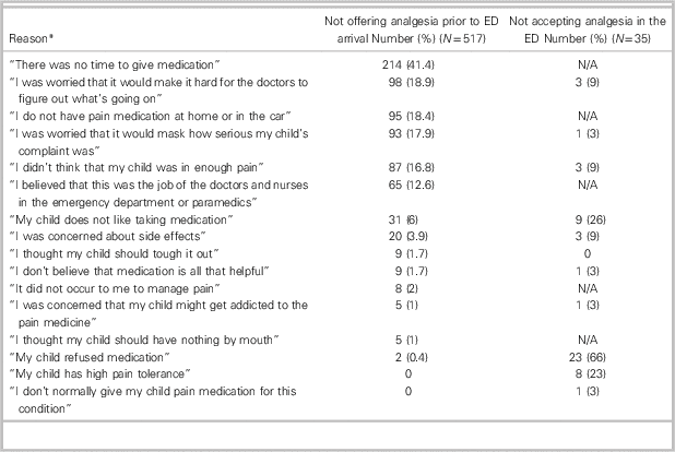 Table 2 Reasons given by caregiver for not offering analgesia prior to ED arrival or accepting analgesia that was offered in the ED