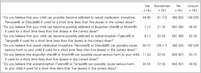 Almost one-fifth of caregivers believed opioids to be harmful and addictive, consistent with emerging literature highlighting caregiver fears surrounding analgesia, particularly opioids.Reference Abou-Karam, Dubé and Kvann 11 , Reference Basco 12 , Reference Rony, Fortier, Chorney, Perret and Kain 14 Interestingly, a large proportion of caregivers was unsure regarding the potential for addiction (20%) and harm (24%) associated with opioids. These findings further emphasize the need for comprehensive caregiver education on indications for opioids and associated risks and benefits. The recent Centers for Disease Control and Prevention recommendations for opioids in chronic painReference Dowell, Haegerich and Chou 52 and evidence that prescription opioid use in childhood is associated with misuse as adults,Reference Miech, Johnston, O’Malley, Keyes and Heard 53 suggesting that even clinicians need more clarity and direction on the long-term effects of short-term opioid use.