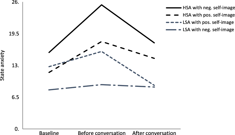 Table 2 presents the main and interaction effects of social anxiety (HSA versus LSA) and self-image (positive versus negative) on state anxiety and SFA. The main effect for social anxiety was significant (p = .002); the HSA group reported more anxiety during the experiment compared with the LSA group. The main effect for self-image on state anxiety was not significant. However, a significant interaction effect between self-image and social anxiety was shown by the fact that the HSA group with a negative self-image were more anxious during and after the conversation compared with both the LSA group, and participants with a positive self-image (see Fig. 1).