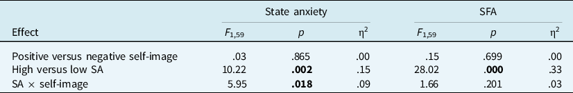 Comparing the self-image groups, no baseline differences were found in social anxiety (negative self-image: mean = 21.41, SD = 12.37; positive self-image: mean = 19.59, SD = 14.15; t 61 = .54, p = .591), state anxiety (negative self-image: mean = 11.96, SD = 7.47; positive self-image: mean = 12.33, SD = 5.11; t 61 = .23, p = .816), and SFA (negative self-image: mean = 15.43, SD = 6.26; positive self-image: mean = 15.62, SD = 8.71; t 61 = .14, p = .889).