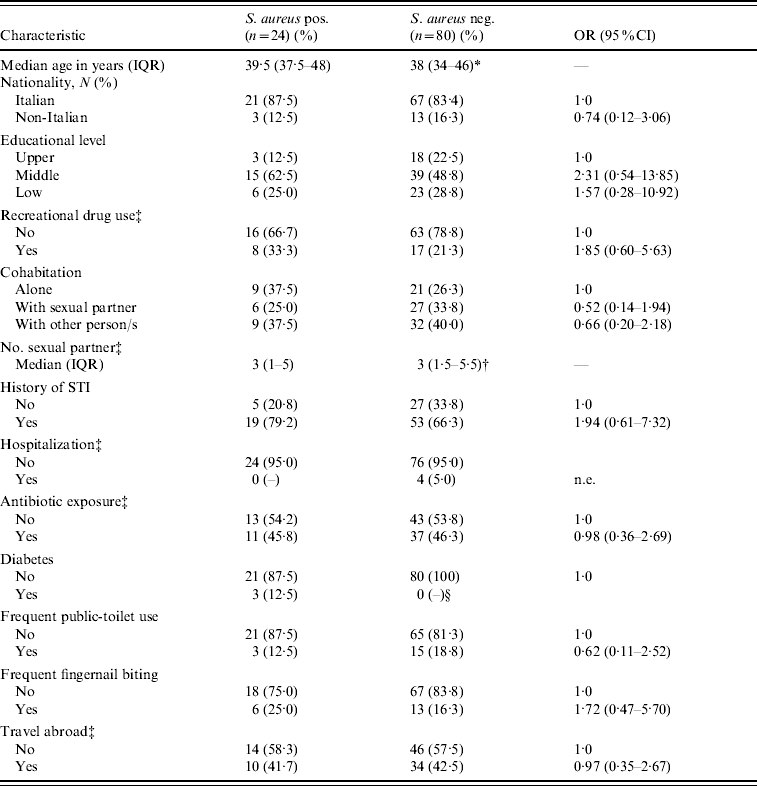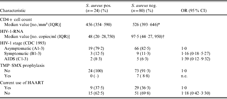Table 1. Demographic, behavioural and medical characteristics of 104 HIV-1-infected MSM, according to S. aureus nasal colonization status