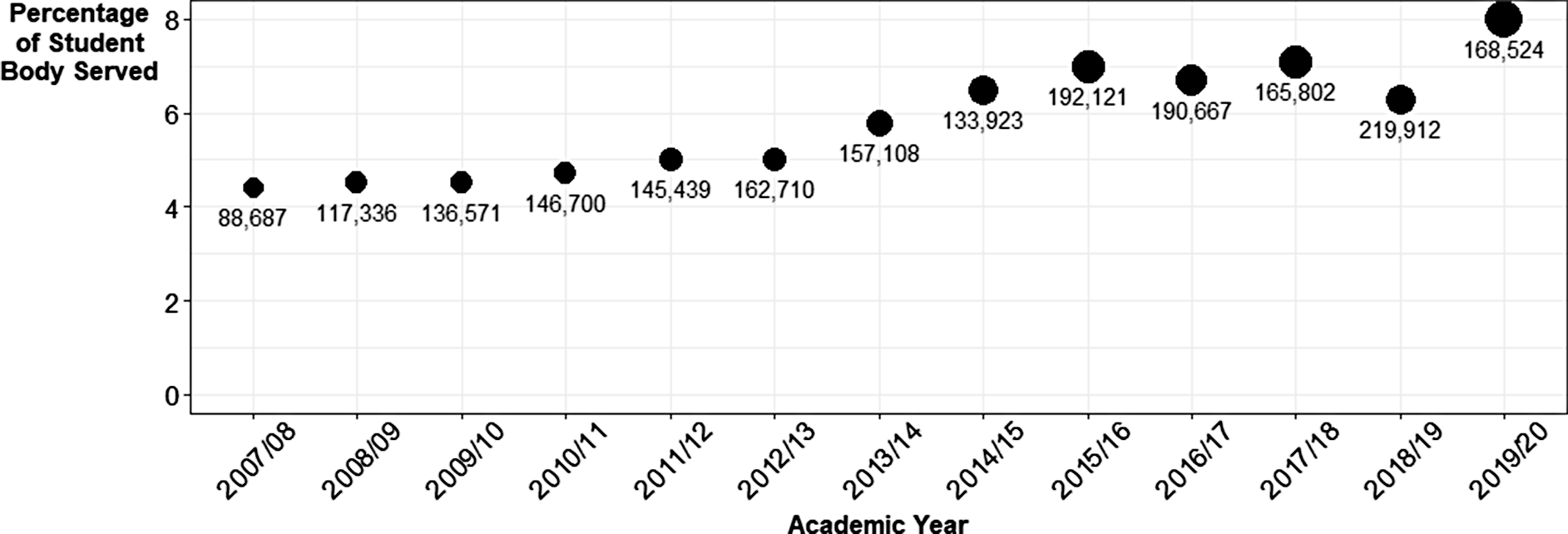 Most Higher Education (HE) students in Ireland are between 18 and 24 years old. This is the time in a person’s life when they are most likely to develop a mental health disorder (Kessler et al., Reference Kessler, Amminger, Aguilar-Gaxiola, Alonso, Lee and Ustün2007; Cuijpers et al., Reference Cuijpers, Auerbach, Benjet, Bruffaerts, Ebert, Karyotaki and Kessler2019), which can affect them well beyond these young adult years (Erskine et al., Reference Erskine, Moffitt, Copeland, Costello, Ferrari, Patton, Degenhardt, Vos, Whiteford and Scott2015). Student mental health and well-being in HE are issues of concern, as demonstrated by this special issue, the recent funding initiatives by the Minister for Further and Higher Education, Research, Innovation and Science, and recent national reports (Dooley et al., Reference Dooley, O’Connor, Fitzgerald and O’Reilly2019; Union of Students in Ireland, 2019; Fox et al., Reference Fox, Byrne and Surdey2020). In Ireland, the Association for Higher Education Access & Disability in 2017/2018 (AHEAD, 2019) noted that the number of students with mental health disorders was increasing twice as fast as other groups of students with disabilities. Within Higher Education Institutions (HEIs), while a number of services provide mental health support to students (e.g., campus GP), the student counselling services (SCSs) are the largest provider of student mental health support, seeing an estimated 7% of the student population (approximately 16,500 students of 237,000 HE students) (PCHEI, 2021a).