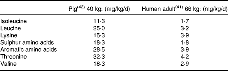 Although the maintenance requirement values for rapidly growing animals can only be determined under physiologically unusual circumstances, it is nevertheless useful to compare such reported maintenance values with current human values for lysine. Values for the rat, pig and human are shown in Table 4 as mg/kg0·75. The summary of pig values reported most recently(Reference Ringel and Susenbeth40) includes values obtained by a variety of different approaches by 5 different authors some of which include slightly higher values than these summarized here but which the authors identified as potential overestimates. Had these been included the mean of all the studies would be slightly higher at 48 mg/kg0·75 or 15 mg/kg. The human values include the recalculated N balance data and the mean value adopted in the 2007 report mainly derived from the stable isotope studies. The former human value tends to be at the upper end of the range for rats and pigs when expressed as mg/kg0·75 but is similar as a proportion of the total requirements and much lower than tissue total IAA content. The latter, stable-isotope-derived value is by far the highest and approaches that of its proportion of IAA in tissue proteins.