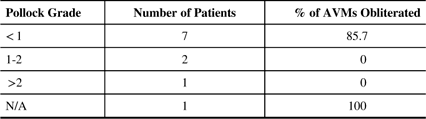 Table 3 displays the Spetzler-Martin grades of 1, 2, and 3 with corresponding obliteration rates of 100%, 75%, and 66% respectively. Similarly, Table 4 displays the number of patients with Pollock radiosurgery grades of less than 1, 1 to 2, and greater than 2 with obliteration rates of 85.7%, 0%, and 0% respectively in the three year follow-up group. One patient had insufficient data to calculate an AVM volume for Pollock grade determination. They did however proceed onto AVM obliteration post-GK.