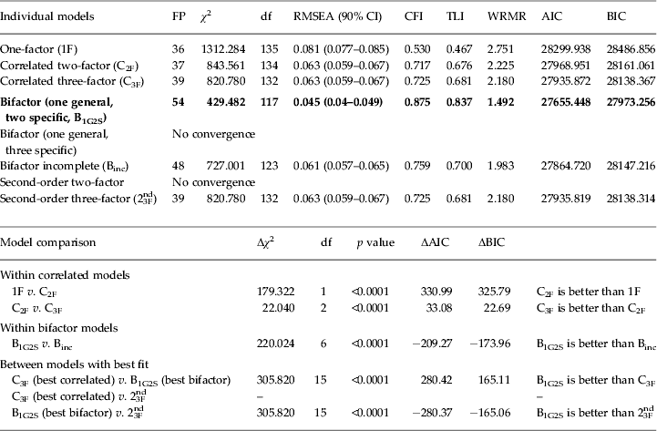 Parameters were estimated using mean and variance adjusted weighted least squares (WLSMV), except for AIC and BIC, which were estimated using the robust maximum likelihood estimator (MLE). Δχ 2 represents the robust chi-square difference test with mean and variance adjusted test statistics. ΔAIC and ΔBIC represent the difference between AIC and BIC for each model comparison: values ⩾10 indicate overwhelming support for the model with the lower AIC and BIC values. Bold values indicate the model that provided the best fit for the data.
