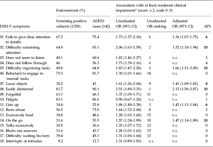 ADHD, Attention-deficit/hyperactivity disorder; OR, odds ratio; CI, confidence interval; APS, all possible subsets; n.s., non-significant association between ADHD symptom and clinical impairment.
