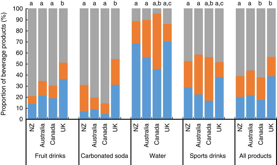 Overall, all four countries had a majority of beverages in all categories that would potentially be subject to taxation using the proposed levy system. Canada had the highest total proportion of products that contained ≥5 % sugar and therefore would be eligible for taxation (82·5 %), this being statistically higher than Australia (76·1 %;