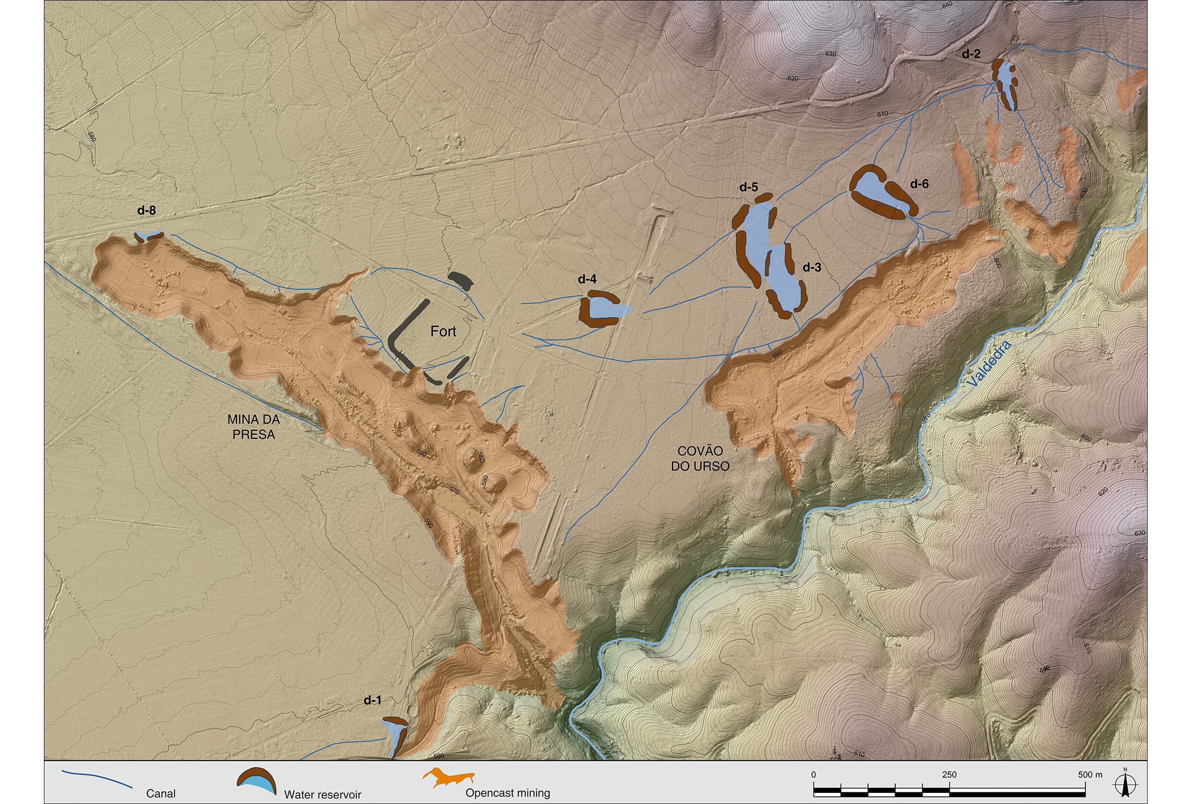 Figure 2. The Mina da Presa and Covão do Urso (Penamacor, Portugal) mining works and reservoirs (figure by Brais X. Currás & F.J. Sánchez-Palencia).