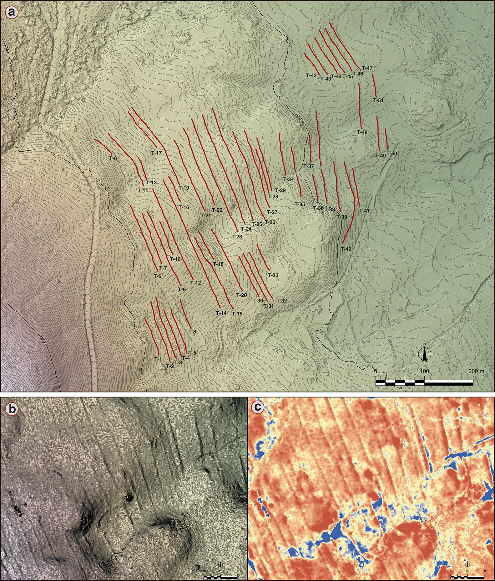 In Las Cavenes del Cabaco (Salamanca, Spain), a study also based on the combination of lidar data and photointerpretation has been performed on the morphology of the mining operations (Figure 4). Research carried out since the 2000s on the settlement associated with the mining area has documented peasant forms of social organisation (Sánchez-Palencia Reference Sánchez-Palencia2014). Functional specialisation or manufacturing centres are not observed. The local peasant communities were expected to work temporarily in the gold mines as part of their tax obligations to Rome. They produced their own sustenance, and the fossilised remains of ancient agricultural terraces have been documented in the immediate vicinity of the mines (Figure 5). The archaeological trenches dug in these structures have confirmed their Roman chronology (Sánchez-Palencia & Currás Reference Sánchez-Palencia, Currás, Mayoral, Grau and Bellón2021), and that their use was contemporaneous with the exploitation of the mines.