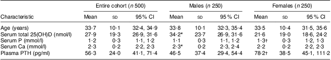 Baseline biochemical and biometric characteristics of the entire cohort, males and females are illustrated in Table 1. Among all the variables, plasma PTH and serum P were significantly higher in females than males (P < 0·05), whereas serum total 25(OH)D and serum Ca were significantly lower in females than in males (P < 0·05).