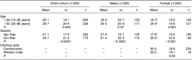 Table 2 presents the serum levels of total 25(OH)D in the entire cohort, males and females according to age group, season and clothing style.