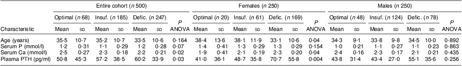 Biochemical and biometric parameters according to vitamin D status in the entire cohort, females and males are illustrated in Table 3. In the entire cohort, ANOVA showed that serum Ca (P = 0·02) was significantly decreased whereas plasma PTH (P = 0·03) was significantly increased between individuals with optimal, insufficiency and deficiency of vitamin D. In females, age (P = 0·04) and serum Ca (P = 0·04) were significantly decreased and plasma PTH (P = 0·004) was significantly increased between individuals with vitamin D insufficiency and deficiency compared with those with optimal total 25(OH)D.