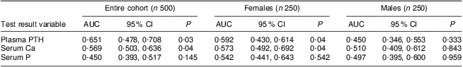 Furthermore, results from ROC curve analyses to examine the ability of biochemical parameters to detect vitamin D deficiency showed that the best predictive markers for vitamin D deficiency in the entire cohort and also females were plasma PTH and serum Ca. A low Ca intake has been reported to aggravate vitamin D deficiency whereas a high Ca intake may reduce the vitamin D requirement( Reference Strife and Hug 33 ). In addition, low Ca intake has also been reported to increase PTH secretion and effectively it may influence vitamin D metabolism. Animal studies suggest that a low Ca intake causes increases in serum PTH and 1,25-dihydroxyvitamin D (1,25(OH)2D) with increased metabolic clearance of 25(OH)D in rats. Therefore low Ca would lead to an increase in serum 1,25(OH)2D from hydroxylation of 25(OH)D, thereby decreasing serum 25(OH)D and inducing or aggravating vitamin D deficiency( Reference Chapuy, Chapuy and Meunier 30 , Reference Clements, Johnson and Fraser 34 ).
