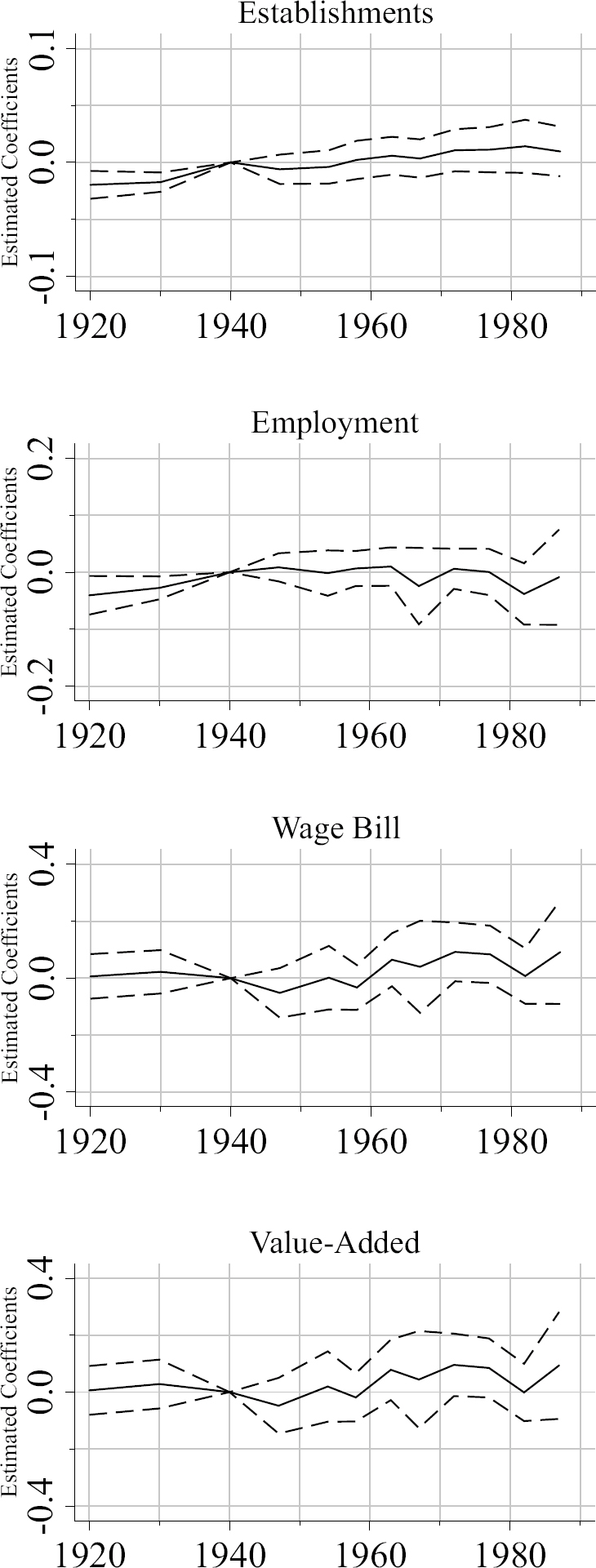 Notes: Each column shows the results of estimating equation (1) for the log of different manufacturing outcomes: establishments (column 1), employment (column 2), wage bill (column 3), and value-added by manufacturing (column 4). All columns are from a specification that includes state-year and county fixed effects as well as county-level controls (interacted with year fixed effects). The years included are 1920, 1930, 1940, 1947, 1954, 1958, 1963, 1967, 1972, 1977, 1982, and 1987. Standard errors (in parentheses) are clustered at the state level. The number of sample counties is 1,086.
