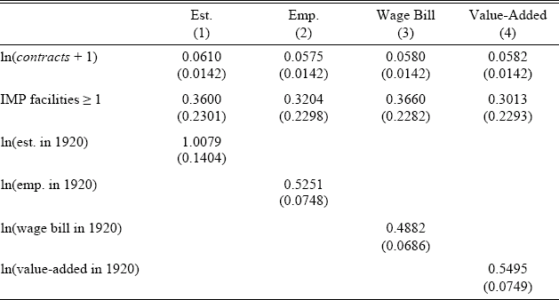 Notes: Each column shows the results of regression of log of wartime investment, ln(invest + 1), on prewar county characteristics. ln(contracts +1) is the value of government spending on supply contracts. Indicator variables are included for the number of facilities assigned under the Industrial Mobilization Plan. The remaining entries are the lagged number of establishments (column 1), employment (column 2), wages (column 3), and value-added (column 4) in 1920. All regressions include prewar county characteristics and state fixed effects. Standard errors (in parentheses) are clustered at the state level. The number of sample counties is 1,086.