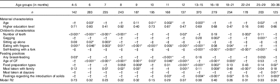 CF, complementary feeding.*Significant P values (P<0·05).†Not tested because variable was not significant in bivariate analyses.‡Not tested because sample size was insufficient for some modalities.§β Values are reported in Fig. 2(a) and (b).