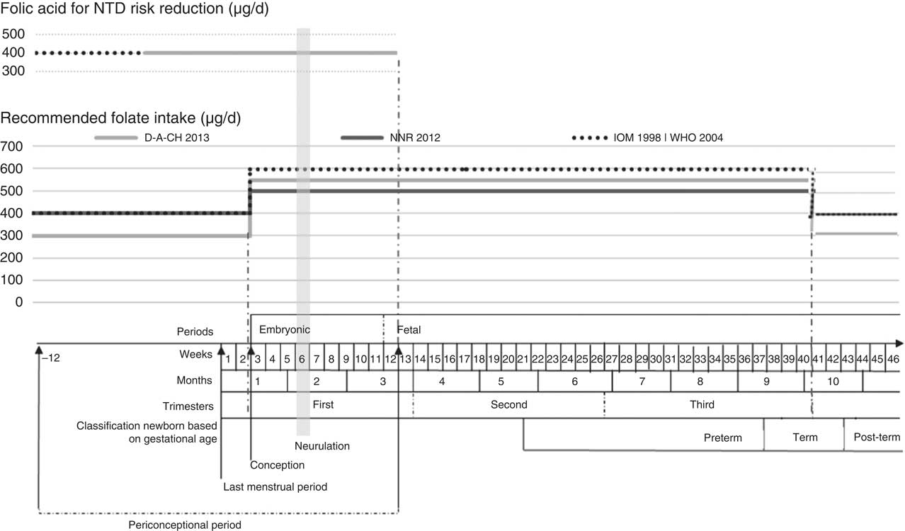 Fig. 2 Recommended folate intake and recommended folic acid supplementation for prevention of NTD during the periconceptional period (NTD, neural tube defects; D-A-CH, Deutschland–Austria–Confoederatio Helvetica (reference values for nutrient intake by the German Nutrition Society, Austrian Nutrition Society, Swiss Society for Nutrition Research and Swiss Society for Nutrition); NNR, Nordic Nutrition Recommendations (by Denmark, Finland, Iceland, Norway and Sweden); IOM, Institute of Medicine, Dietary Reference Intakes; WHO, Vitamin and Mineral Requirements in Human Nutrition ( 42 )). Definition of periconceptional period adapted from Steegers-Theunissen et al.( Reference Steegers-Theunissen, Twigt and Pestinger 44 )