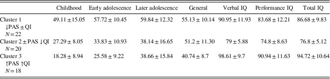 Analysis of variance (ANOVA) and chi-square test (for dichotomic variables) were performed to compare the groups produced by the cluster analysis, on the basis of their IQ and PAS scores, on demographic, clinical, neurocognitive, and ToM basal measures. After Bonferroni’s correction for multiple comparisons, the significance level was set at p<.003. Post hoc analyses with Fisher least significant difference (LSD) were used to yield significant differences between groups. For these analyses, we had a power of 0.80 to detect a medium-large effect size (f=0.4) at a type 1 error level of p<.05 (Steiger, Reference Steiger2004).