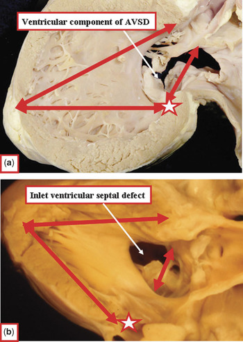 Figure 11 The images compare the phenotypic features of the ventricular component of the defect seen in atrioventricular canal malformations (Fig. 11a) and the hole bordered by fibrous continuity between the leaflets of the aortic and tricuspid valves in hearts with separate atrioventricular junctions (Fig. 11b). In addition to the differences in junctional morphology, the holes differ with regard to the inlet-outlet dimensions of the ventricular septum (long arrows), the extent of the hole relative to the crux (short arrows and star), and the degree of unwedging of the aortic valve.